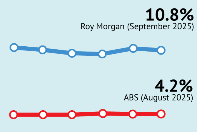 • Underemployment & underutilisation: Think part-timers chasing hours or multiple job-holders patching income. Alternative gauges (e.g., Roy Morgan’s series) consistently show higher “real” unemployment/under-employment than the ABS headline. Methodologies differ, but the gap is exactly the point: the headline rate understates slack.